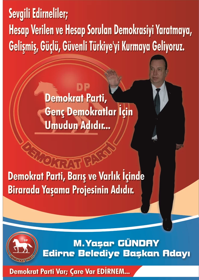 Demokrat Parti (DP) Edirne Belediye Başkan Adayı M. Yaşar Günday, gazetemize yaptığı açıklamada; “Demokrat Parti ülkemizin taşında toprağında alın teri ve şehitlerinin kanı olan tek partidir. Acımasız emperyalist sistemin ülkemizde yok edemediği, yok edemeyeceği tek partidir. Küllerinden doğup; Bu ülkenin ve bu ülkenin insanlarının bütün değerlerini geri getirecek ve misak ı millide çizilmiş bütün kırmızıçizgileri yeniden çizecek tek partidir. Kimsenin şüphesi olmasın ki; bu gün bizim; Doğruları korkmadan haykıracak yüreğimiz, hala bükülemeyen bir bileğimiz, her şey bir yana gerçek anlamda inandığımız Allah'ımız var. Denizleri yakamıyoruz belki ama yüreğimizle yaktığımız meşalemizi içine soktuğumuzda coz diye ses çıkarttığımız okyanuslar var.” Dedi.