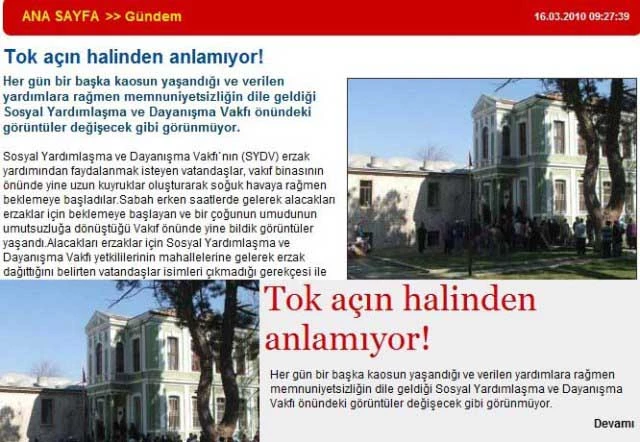 Yapılan haberlerde Sosyal Yardımlaşma ve Dayanışma Vakfı'nın yardım yerine boş laflarla umut dağıttığını ileri süren habere tepki gösteren yetkililer, yapılan yardımları tek tek açıkladı. Yardımları ellerinden gelen en hızlı sürede tamamlamaya çalıştıklarını belirten yetkililer, " "Tok Açın Halinden Anlamıyor" başlığı altında yapılan haberde kişilerin soğuk havada Vakıf Hizmet Binasının dışında bekletildikleri, Vakıf Hizmet Binası'nınn içinde ise personelin çay, kahve içtiği hatta kahvaltı yaptığı, kişilere yardım yerine umut vaatleri dağıtıldığı ifadeleri kullanılmış, izin almadan Vakıf Hizmet Binası içerisinde kamera çekimi yapılmıştır. Vakıf Mütevelli Heyetin aldığı karar gereği ihtiyaç sahibi 3 bin 300 aileye gıda ve temizlik malzemesi yardımı yapılması uygun bulunmuş ve akabinde ihale sürecinin tamamlandığı gün, yardım dağıtımlarına seri bir şekilde başlanmış ve 12-13 Mart 2010 tarihlerinde bin 800 ailenin yardım paketleri teslim edilmiştir. 13 Mart 2010 Cumartesi günü hafta sonu tatili olmasına rağmen çay kahve içtiği ifade edilen personelin tümü, tam gün gıda paketlerinin dağıtımını yaparak ailelere yardım paketlerinin teslimatını gerçekleştirmişlerdir. Kızılay Aşevi Müdürlüğü ve Vakfımız ile aynı yönde yardımlarda bulunan Vakıflar Bölge Müdürlüğü ile yapılan koordineli çalışmalar sonucu aynı kişilerin adı geçen kurumlardan ayrı ayrı yardım almalarını önlemek amacıyla tedbirler alınmış ve alınan tedbirler gereği bu kurumlardan yardım alanların Vakıftan dağıtımı yapılan gıda paketlerinden alamayacaktan, aynı zamanda SGK kapsamında olup maaş alan kişilere yardım yapılmayacağı ifade edilmişse de ısrarla Vakıf Hizmet Binasına gelerek yardım talebinde bulunmakta ve gereksiz kalabalıklar oluşturmaktadırlar" ifadelerine yer verildi.