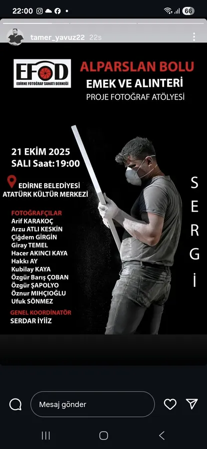 Bu çalışmaların en çarpıcılarından biri de dün —21 Ekim 2025 Salı günü— saat 19.00’da başlayan Alpaslan Bolu Emek ve Alın Teri Proje Atölyesi tarafından hazırlanan sergiydi. EFOT Yönetim Kurulu Üyesi fotoğraf sanatçısı Alpaslan Bolu ve atölyesinde yer alan fotoğraf sanatçıları; Genel Koordinatör Serdar İyiyiz öncülüğünde Arif Karakoç, Arzu Atlı Keskin, Çiğdem Girgin, Giray Temel, Hacer Akıncı Kaya, Hakkı Ay, Kubilay Kaya, Özgür Barış Çoban, Özgür Şapalyo, Öznur Mıhçıoğlu ve Ufuk Sönmez, izleyicileri Edirne Belediyesi Atatürk Kültür Merkezi’nde bir araya getirdi.