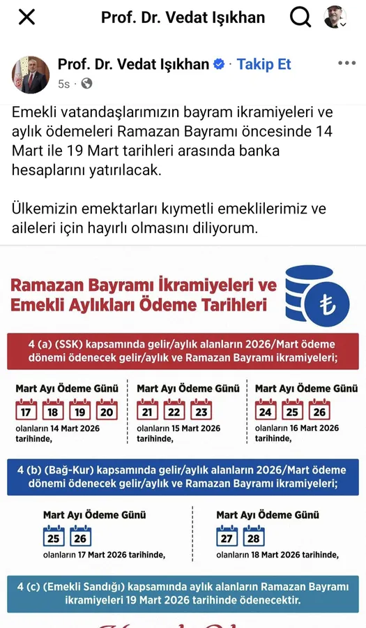 Bakan Vedat Işıkhan, sosyal medya hesabından yaptığı açıklamada emekli vatandaşların maaş ve bayram ikramiyelerinin 14 Mart ile 19 Mart 2026 tarihleri arasında banka hesaplarına yatırılacağını duyurdu.