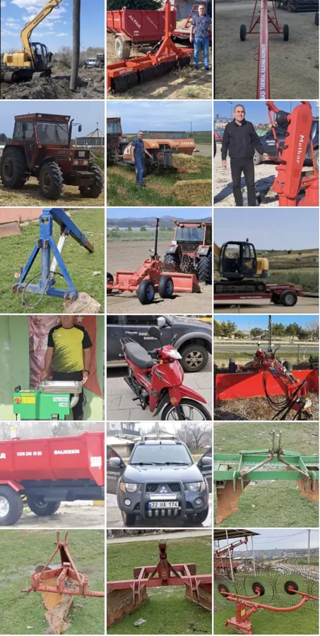 1 Mitsubishi L200, 2 Skoda araç, 1 Tümöson traktör, 1 damperli 5 tonluk römork, 1 balya makinesi, 1 paletli kepçe, 1 taşıyıcı dorse, 1 su tankeri, 11 metre uzunluğunda helezon, 4 tonluk süt soğutma tankı, 1 salça makinesi, 3 metrelik lazer, pulluk, merdane, düzleme bıçağı, ot çevirme makinesi, tırmık, ızgara ve 5 tonluk calaskal,Motosikle bulunuyor.