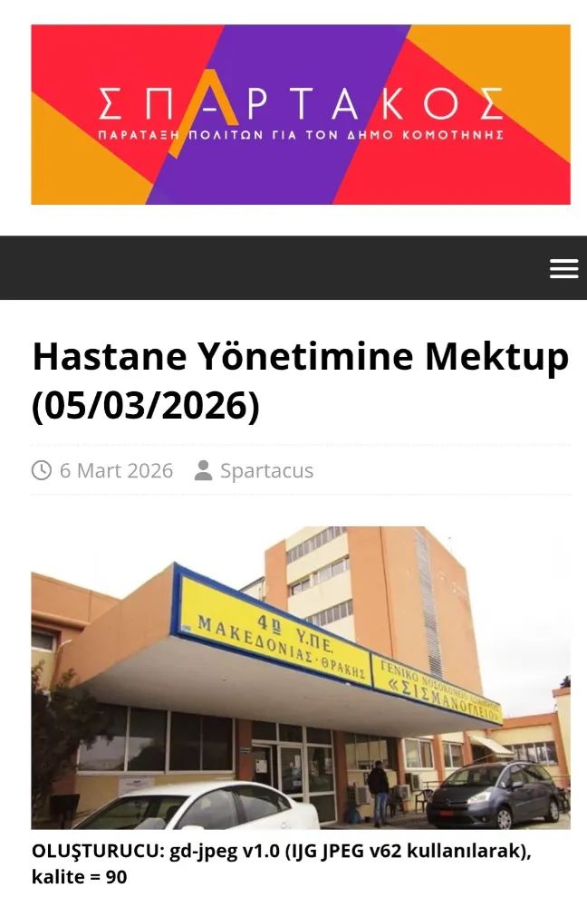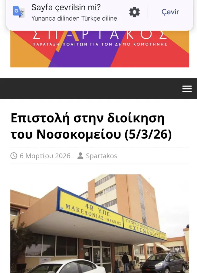 Kendini “Spartaküs Yurttaşlar Hareketi” olarak tanıtan bir grup, Komotini Genel Hastanesi yöneticisi Rofaela Eleni’ye hitaben kaleme aldığı mektupta hastanedeki bazı uygulamalardan rahatsızlık duyduklarını dile getirdi.