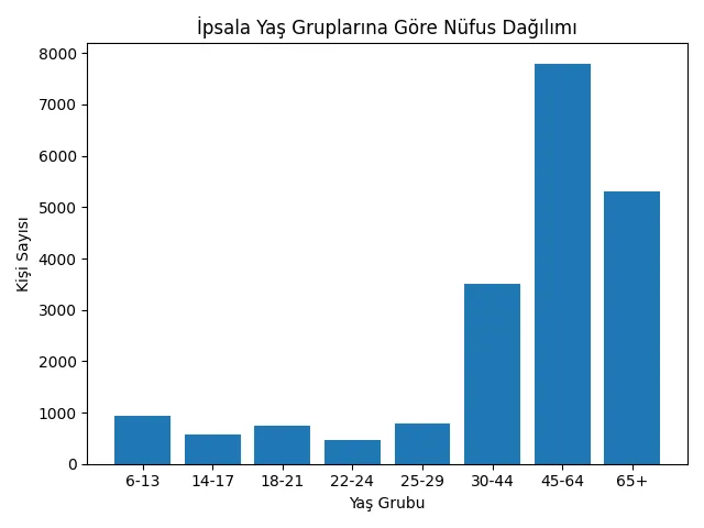 Veriler incelendiğinde İpsala’da özellikle 18-29 yaş grubunun toplam nüfus içindeki payının daha sınırlı olduğu, buna karşılık 45 yaş üzeri nüfusun oldukça yüksek olduğu görülüyor.