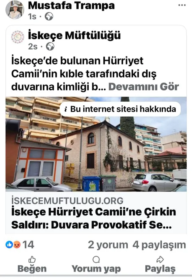 “Özellikle Ramazan ayında kutsal mekânımıza yapılmış olan bu menfur eylem Batı Trakya Türk Azınlığı’nı derinden yaralamış ve endişelendirmiştir. Camimize ve azınlığımıza karşı yapılan bu eylemi şiddetle kınıyor; faillerin bir an evvel yetkili makamlar tarafından tespit edilip cezalandırılmasını temenni ediyoruz.”