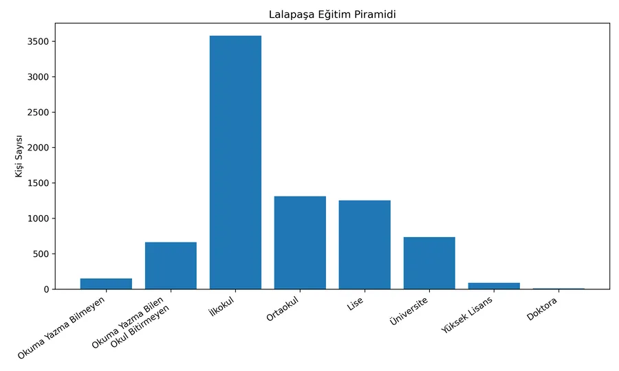 Ortaya çıkan tablo, Lalapaşa’da eğitim seviyesinin büyük ölçüde temel eğitim düzeyinde yoğunlaştığını gösterirken, ilçenin kırsal demografik yapısının eğitim dağılımına da yansıdığı görülüyor.