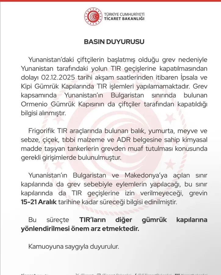 T.C. Gümülcine Başkonsolosluğu’ndan alınan resmi bilgi grevin bölgedeki lojistik akışı ciddi şekilde sekteye uğrattığını ortaya koyuyor.