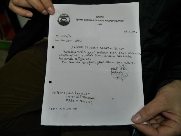 Edirne İşitme Engelliler Spor Kulübü Derneği Yönetimi Belediye Başkanı Recep Gürkan'a sekiz aydır (8 Ay) ulaşamadıklarını söylediler. Edirne İşitme Engelliler Spor Kulübü Derneği 2'nci Başkanı Adnan Bülbül, Belediye Başkanı Recep Gürkan'dan 15 Nisan 2014 tarihinden buyana yaklaşık 20 kez randevu talebinde bulunduklarını ama henüz kendilerine dönüş yapılmadığını söyledi.