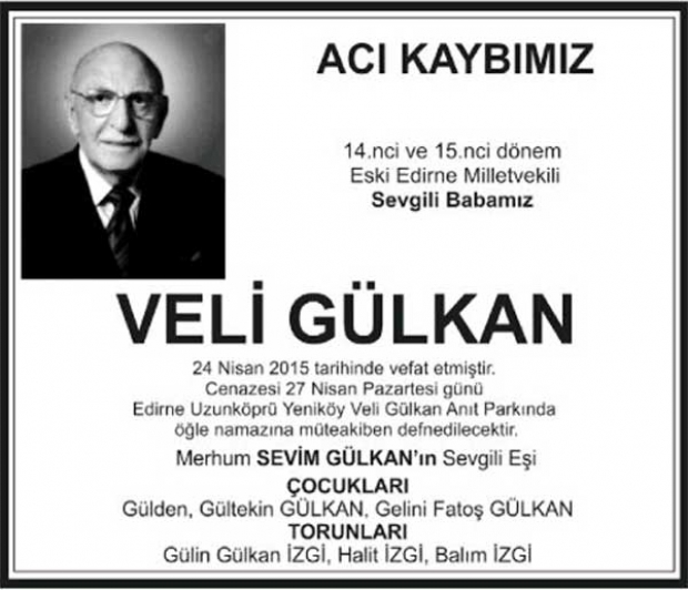 1969-1973 yılları arasında Adalet Partisi Milletvekili olarak mecliste görev yapan Uzunköprü Yeniköy'lü Veli Gülkan Cumartesi günü tedavi gördüğü hastanede hayatını kaybetti. Tam bir Edirne Sevdalısı olan Merhum, Milletvekili Veli Gülkan'ın cenaze töreni Yeniköy'de 27 Nisan 2015 Pazartesi günü (Bugün) Öğle namazına müteakip defnedildi.