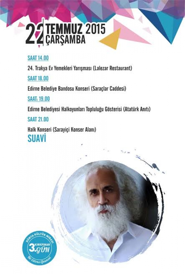 22 Temmuz 2015 Çarşamba Günü, Lalezar Restoran'da 24. Trakya Ev Yemekleri Yarışması, 18.00'da Saraçlar Caddesi'nde Edirne Belediye Bandosu Konseri, Saat 19.00'da Edirne Belediyesi Halkoyunları Topluluğu Gösterisi, Saat 21.00'da Sarayiçi Konser Alanında 'Suavi' konseri düzenlenecek.