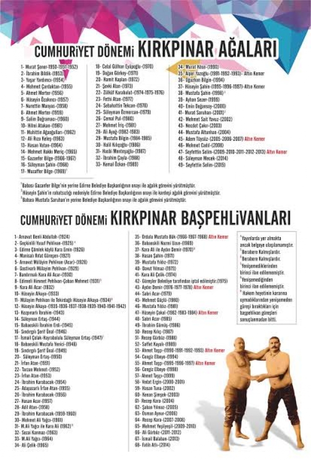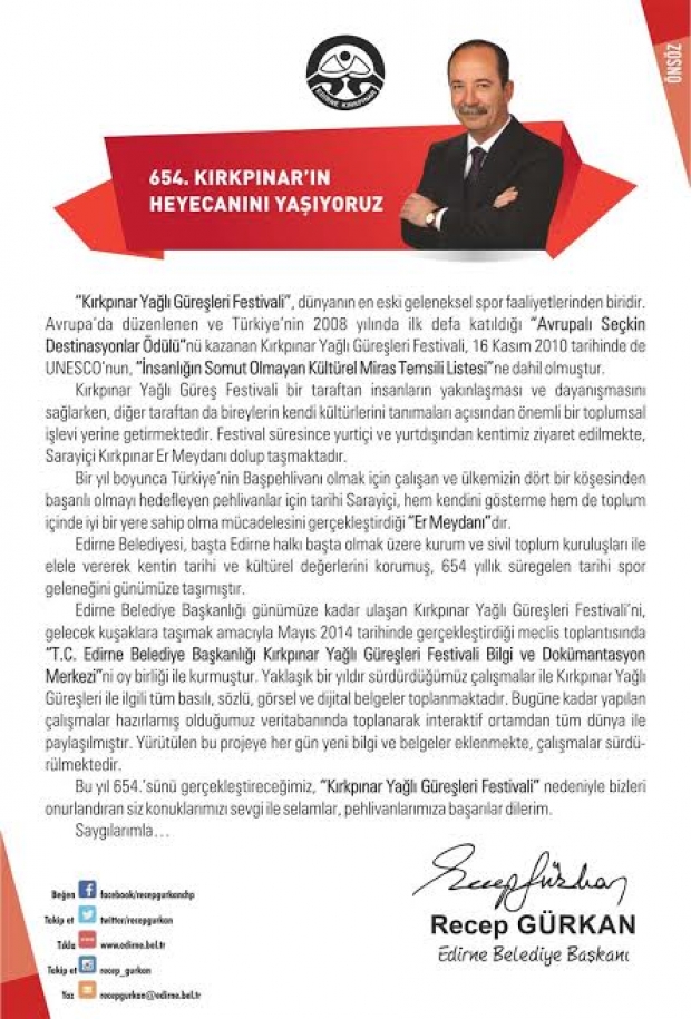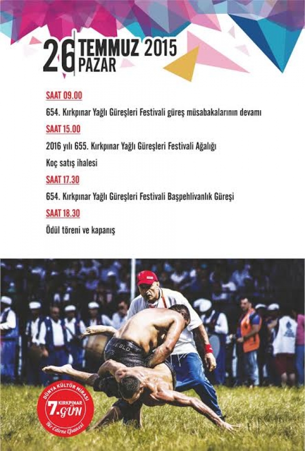 Edirne Belediye Başkanlığı tarafından 20-26 Temmuz 2015 tarihlerinde düzenlenen 654. Kırkpınar Yağlı Güreşleri Festivali'ne geri sayım başladı. 654 yıllık geleneği yaşatmak, Edirne'yi yurtiçi ve yurtdışında tanıtmak, yağlı güreşleri gelecek nesillere aktarmak adına düzenlenen 654. Kırkpınar Yağlı Güreşleri Festivali, birbirinden eğlenceli ve farklı organizasyonlara ev sahipliği yapacak.