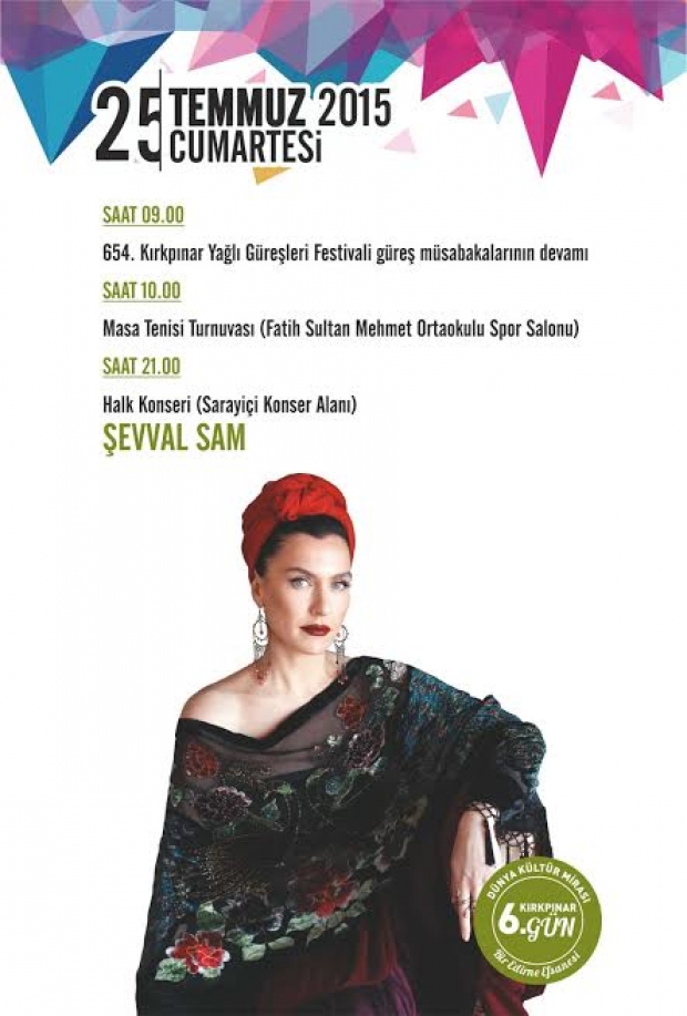 25 Temmuz 2015 Cumartesi ise, 654. Kırkpınar Yağlı güreşleri Festivali, güreş müsabakalarının devamı, Saat 10.00'da Fatih Sultan Mehmet Ortaokulu Spor Salonu'nda masa tenisi turnuvası ve saat 21.00'da Şevval Sam konseri düzenlenecek.