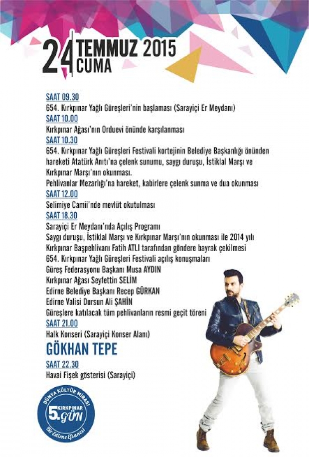 24 Temmuz 2015 Cuma günü ise, Kırkpınar Ağası Orduevi'nde karşılanacak. Belediye önünden hareket edecek olan kortej, Atatürk Anıtı'na çelenk sunumunun ardından, Pehlivanlar Mezarlığını ziyaret edecek. Saat 12.00'da Selimiye Camii'nde okutulacak olan mevlittin ardından program saat 18.30'da Sarayiçi'ndeki açılış programıyla devam edecek. Cuma günkü etkinlikler Sarayiçi'nde Gökhan Tepe Konseri ve Havai fişek gösterisiyle devam edecek.