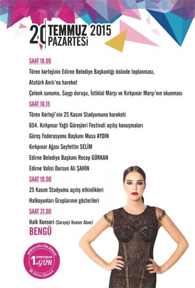 20 Temmuz 2015 Pazartesi günü saat 18.00'da Edirne Belediye Başkanlığı önünde toplanacak olan kortejin Atatürk Anıtı'na hareket etmesiyle başlayacak olan 654. Kırkpınar Yağlı Güreşleri Festivali, Çelenk Sunumu, Saygı Duruşu, İstiklal Marşı ve Kırkpınar Marşı'nın okunmasının ardından, kortejin 25 Kasım Stadyumuna hareket etmesiyle devam edecek. Açılış konuşmalarının ardından saat 19.00'da halkoyunları grupları yöresel oyunları sergilerken, ünlü ses sanatçısı Bengü ise, Sarayiçi'nde Edirnelilerle bir araya gelecek.