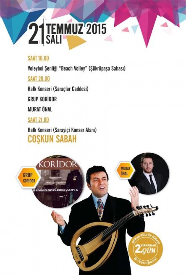 21 Temmuz 2015 Salı Günü ise festival, Şükrüpaşa Sahası'nda Voleybol Şenliği, Saraçlar Caddesi'nde saat 21.00'de Grup Koridor ve Murat Önal'ın konseri, yine aynı saatte Sarayiçi'nde Coşkun Sabah konseriyle devam edecek.