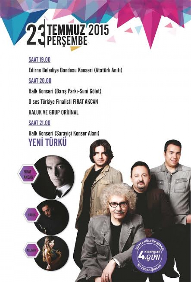 23 Temmuz 2015 Perşembe günü ise, Edirne belediye Bandosu Atatürk Anıtı'nda konser verirken, saat 20.00'da Barış Parkı-Suni Gölet'e O Ses Türkiye Finalisti Fırat Akcan, Haluk ve Grup Orijinal Konseri, Saat 21.00'da ise Sarayiçi'nde Yeni Türkü Edirnelilerle buluşacak.