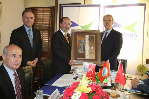 Marmara Belediyeler Birliği Başkanı Recep Altepe günün anısına Edirne Belediye Başkanı Recep Gürkan'a ahşap üzerine Sedef çalışması hediye etti. Marmara Belediyeler Birliği Encümen Toplantısı basına kapalı olarak devam etti.