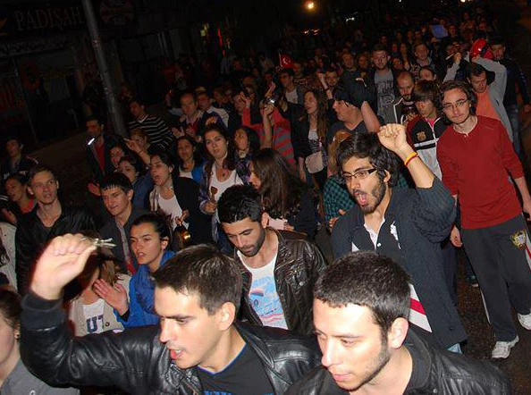 Bir süre Saraçlar caddesinde eylemlerini sürdüren binlerce kişi, 'Onuncu Yıl Marşı'nı okuyarak, tekrar Atatürk anıtına yöneldi. Bu sırada trafikte seyir halindeki yüzlerce araçta bulunan vatandaşlar ellerindeki bayraklar ve tencerelerle göstericilere destek verdiler. Atatürk anıtında İstiklal marşını okuyan kalabalık halk marşlar söyleyerek ve sloganlar atarak mahallelerine döndüler.