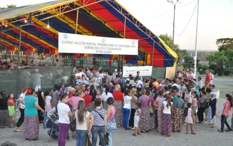 Edirne Valiliği Sosyal Yardımlaşma ve Dayanışma Vakfı Ramazan İftar Çadırı Kurdu. Edirne Valiliği Sosyal Yardımlaşma ve Dayanışma Vakfı’nın düzenlemiş olduğu 800 kişilik Ramazan iftar çadırı kuruldu. Edirne Valiliği Sosyal Yardımlaşma ve Dayanışma Vakfı, hayırsever vatandaşlarında desteğiyle Selimiye Camii meydanına 800 kişilik iftar çadırı kurdu. İlk iftar yemeğinde mercimek çorbası, tas kebabı, pilav, helva ile ayran ikram edildi. Dağıtılan yemeklerden almak isteyenler için çadırın girişine iki ayrı platform kuruldu, Kadınlar ve erkekler ayrı taraftan sıraya girerek yemeklerini aldılar. Edirne Valisi Gökhan Sözer’in de katıldığı iftar çadırında, vatandaşlar okunan ezanın ardından oruçlarını açtılar. Halk iftar Çadırına büyük ilgi gösterdi, Çadır içinde yer bulamayan halk Selimiye Meydanı’ndaki parkta çimenlere oturarak iftarlarını açtı. Sosyal Yardımlaşma ve Dayanışma Vakfı yetkilileri, bin 500 kişilik yemek hazırlandığını ve iftar çadırdında ramazan ayı boyunca yemek dağıtılacağının haberini verdi.
