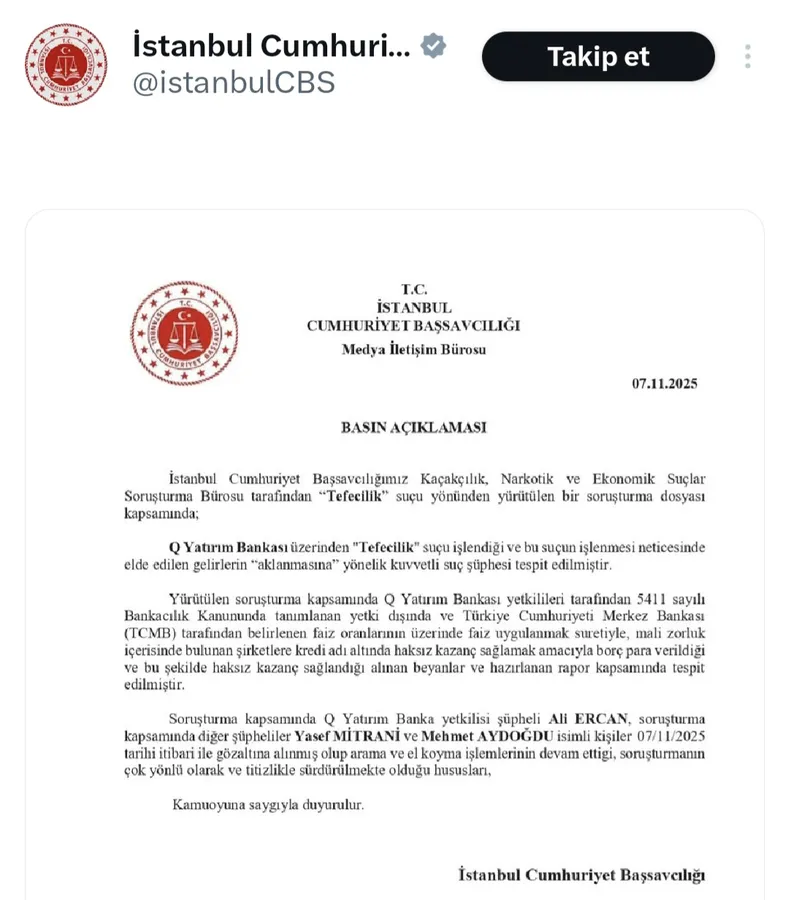 İstanbul Cumhuriyet Başsavcılığı, Q Yatırım Bankası hakkında “tefecilik” suçlamasıyla kapsamlı bir soruşturma başlattı. Banka üzerinden yürütülen yasa dışı kredi faaliyetleriyle mali zorluk yaşayan şirketlere yüksek faizle borç verildiği, bu yolla haksız kazanç sağlandığı tespit edildi. Soruşturma kapsamındaEdirne’nin köklü ailelerinden Mitrani ailesinin bir ferdi olan Yasef Mitrani gözaltına alındı.