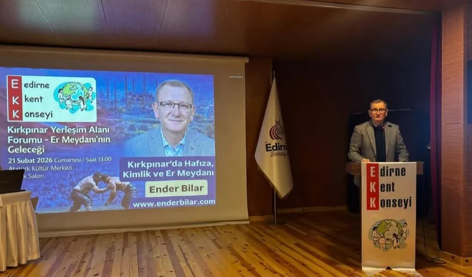 Edirne Kent Konseyi tarafından 21 Şubat 2026 tarihinde düzenlenen “Kırkpınar Yerleşim Alanı Forumu – Er Meydanı’nın Geleceği” programında konuşan araştırmacı ve kültür insanı Ender Bilar, Kırkpınar’ın yalnızca bir spor organizasyonu olarak değerlendirilemeyeceğini ifade etti.