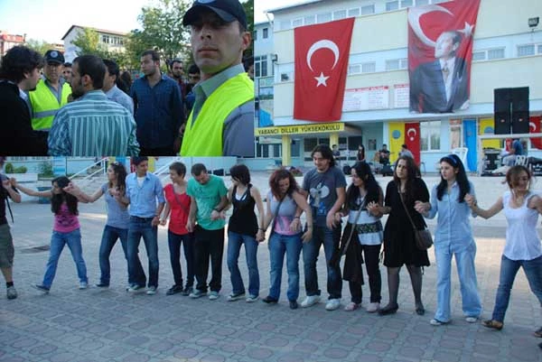 Öğrenci topluluğu konserinde halay çeken öğrenciler, özel güvenlik tarafından durdurulmak istendi. Trakya Üniversitesi 17. Kültür Sanat ve 27. Spor Şenlikleri çerçevesinde üniversitenin Ayşekadın Yerleşkesi'nde bir öğrenci topluluğu olan Düşün Sanat Müzik Grubu konserinde, özel güvenlik biriminin ilginç yasak uygulaması, 80 sonrası konulan yasakları aratmayacak türden. Ağırlıklı olarak Türk Halk Müziği eserlerini çalıp söyleyen grubun, halay havası çalmasıyla konseri dinleyen öğrenciler halay çekmeye başladı. Ancak bunun üzerine özel güvenlik görevlileri halay çeken grubun yanına gelerek, halay çekilmesinin yasak olduğunu ve bunun durdurulması gerektiğini söyleyince öğrenciler adeta şaşkına döndü.