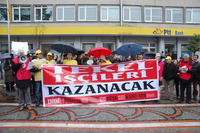 TEKEL işçilerinin direnişinin 75. gününde, yurt genelindeki demokratik kitle örgütlerinin destek eylemleri aralıksız devam ederken, Edirne'de bugün gerçekleştirilmesi planlanan oturma eylemine yağmur engel oldu. Edirne'de faaliyet gösteren işçi sendikaları konfederasyonları üyeleri, öğle saatlerinde Saraçlar Caddesi'nde bir oturma eylemi yapacağını duyurmuştu ancak yoğun sağanak yağışın azizliğine uğrayan destekçiler, yalnızca basın açıklaması ve sloganlarla seslerini duyurmaya çalıştı. Gözaltına alınan arkadaşlarının derhal serbest bırakılması gerektiğini vurgulayan işçiler, "İki buçuk aydır Türkiye'nin şahit olduğu bu inanç ve kararlılık artık tarihe yazılmıştır ve bu mücadelenin kaybedeni her ne olursa olsun AKP hükümeti olacaktır. Emekçiler asla kaybetmeyecektir" diyerek kararlılıklarını dile getirdi. Türkiye İşçi Sendikaları Konfederasyonu (TÜRK - İŞ) Devrimci İşçi Sendikaları Konfederasyonu (DİSK) Kamu Emekçileri Sendikaları Konfederasyonu (KESK) ve Türkiye Kamu Çalışanları Sendikaları Konfederasyonuna (Kamu - Sen) bağlı sendikaların üye ve temsilcileri, hazırladıkları ortak basın açıklamasında, hükümetin TEKEL işçilerine karşı tutumu bir kez daha sert bir dille eleştirdi.
