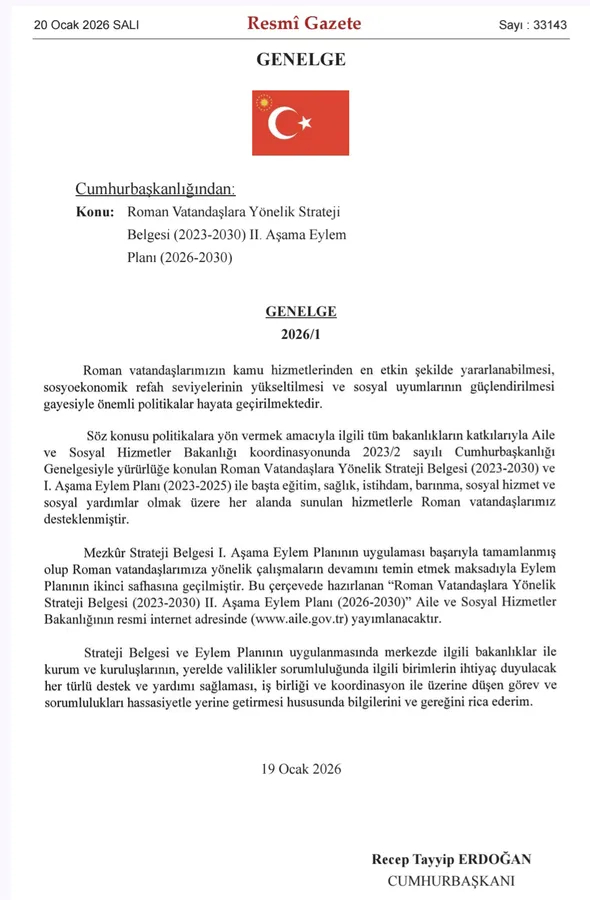 Cumhurbaşkanı Recep Tayyip Erdoğan imzasıyla yayımlanan genelgede; Roman vatandaşların kamu hizmetlerinden daha etkin yararlanması, toplumsal hayata tam ve eşit katılımının sağlanması temel hedef olarak vurgulandı. Yeni eylem planı; eğitim, istihdam, sağlık, barınma ve sosyal uyum başta olmak üzere birçok alanda atılacak adımları kapsıyor.