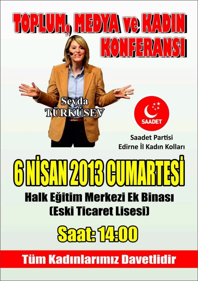 Saadet Partisi Kadın Kolları, “Toplum, Medya ve Kadın” konulu bir konferans düzenledi. Saadet Partisi Kadın Kollarından yapılan açıklamada, “6 Nisan Cumartesi günü Saat: 14.00’te yapılacak olan konferansımız Halk Eğitim Merkezi Ek binasında (Eski Ticaret Lisesi) düzenlenecek olup, Konferansa yaptığı TV programlarıyla toplumumuzun yakından tanıdığı ve beğenisini kazandığı Kişisel Gelişim Uzmanı – Yazar Sevda Türküsev konuşmacı olarak katılacaktır.” Dendi.