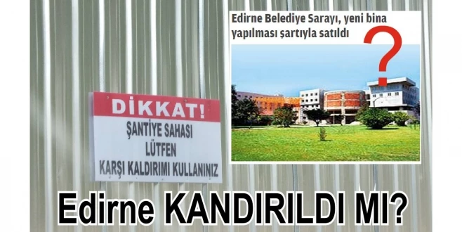 Trakyabirlik Kavşağı'ndaki Edirne Belediye Sarayı yıkılıp yerine alışveriş merkezi yapılacak. Alıcı şirket, ihale şartnamesi gereği, 5 milyon YTL keşif bedelli yeni belediye binasını da bedelsiz inşa edecek… ti BELEDİYE BAŞKANI RECEP GÜRKAN BUNU UNUTTU MU !!!?