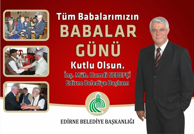 Edirne Belediye Başkanı Hamdi Sedefçi babalar günü nedeniyle yaptığı açıklamada, “karşılıksız sevgi, sınırsız hoşgörü ve mutluluk kaynağı olan babalarımızın BABALAR GÜNÜ’nü kutluyorum.”dedi.